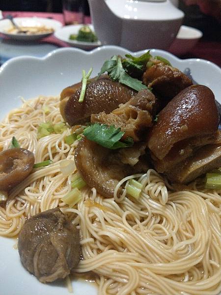 主要餐點以海鮮為主,無菜單,菜色除了價位600.800.1000或可能更高以外,若有特殊需求也可以事先溝通。本次同行者有人對甲殼類過敏所以沒有蝦,蟹類。有提供素食餐,看起來頗精緻。生日招待豬腳麵線。